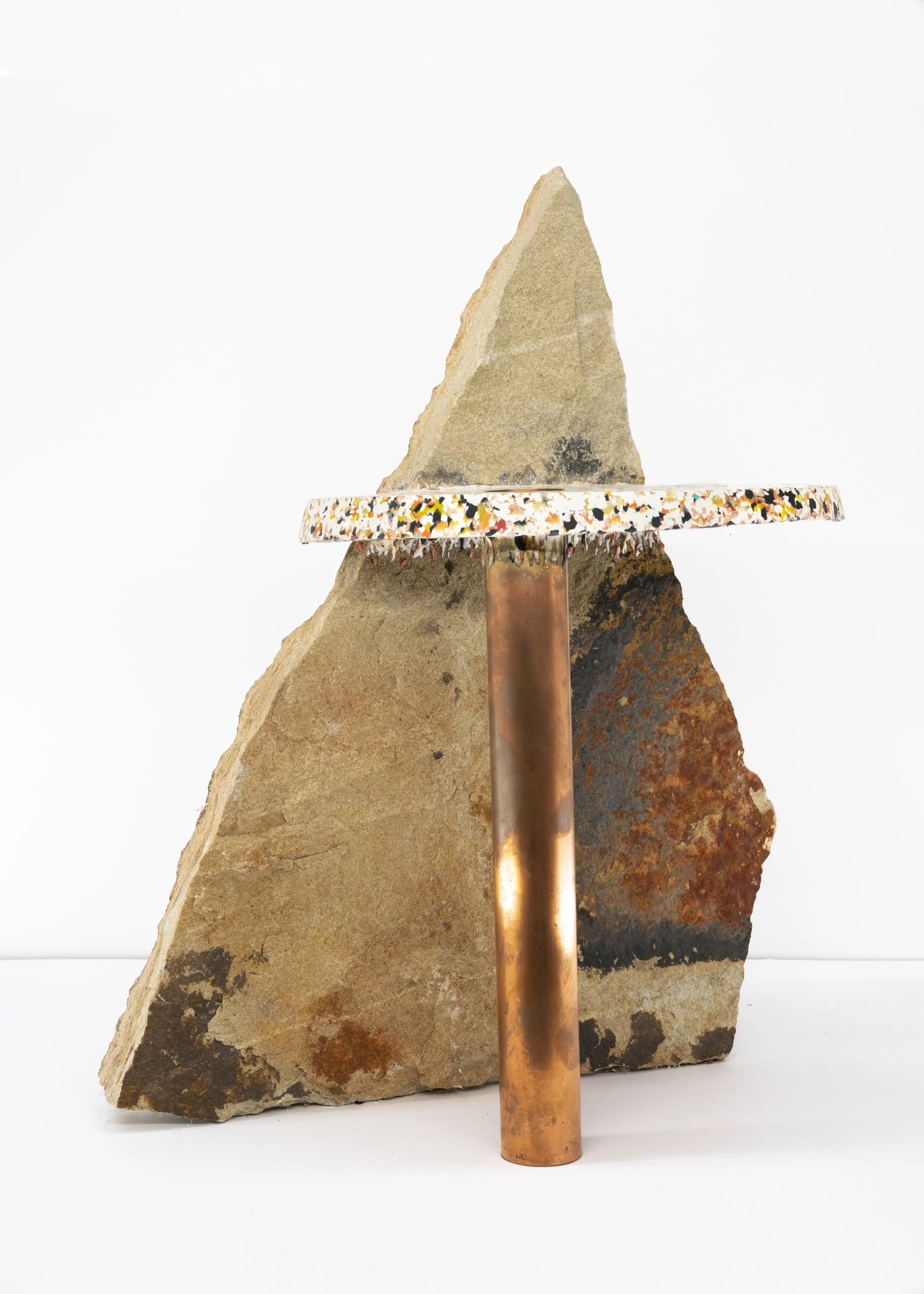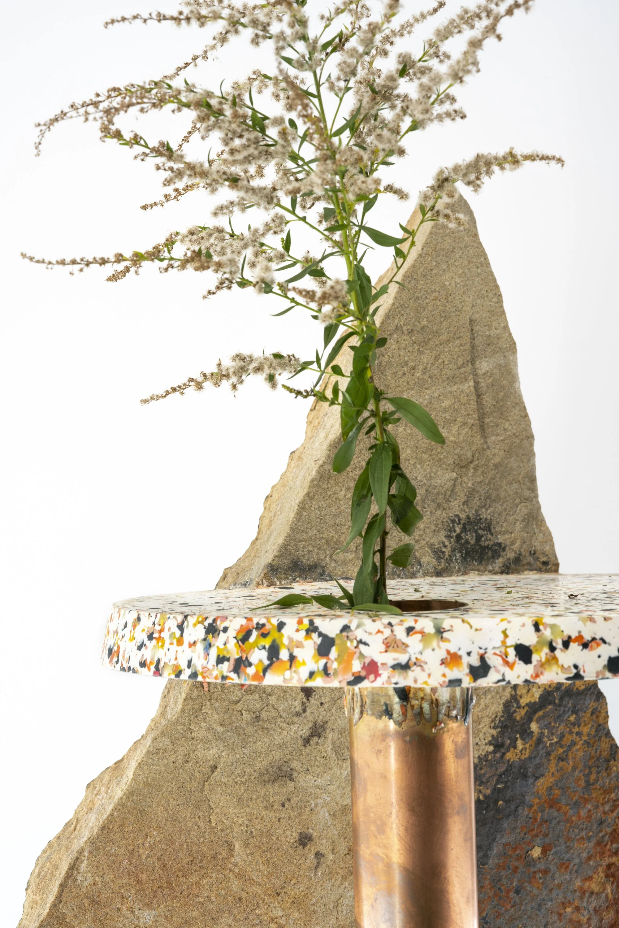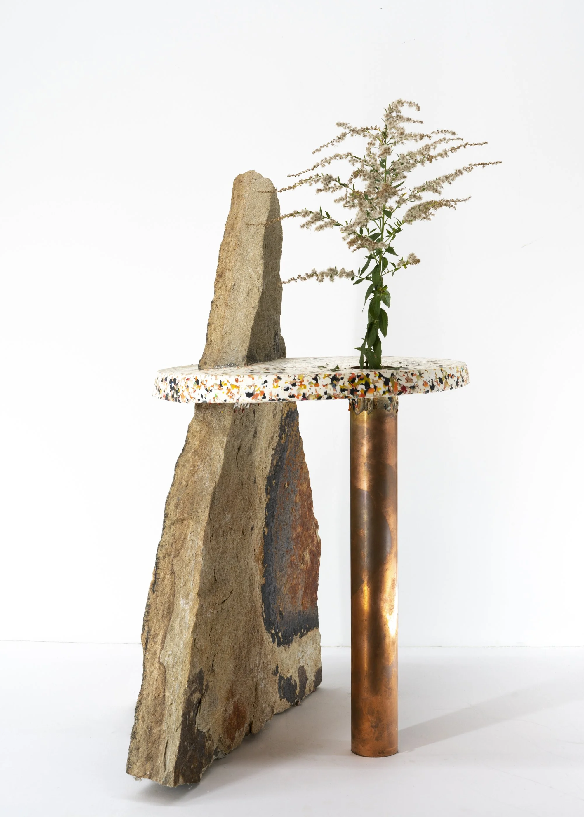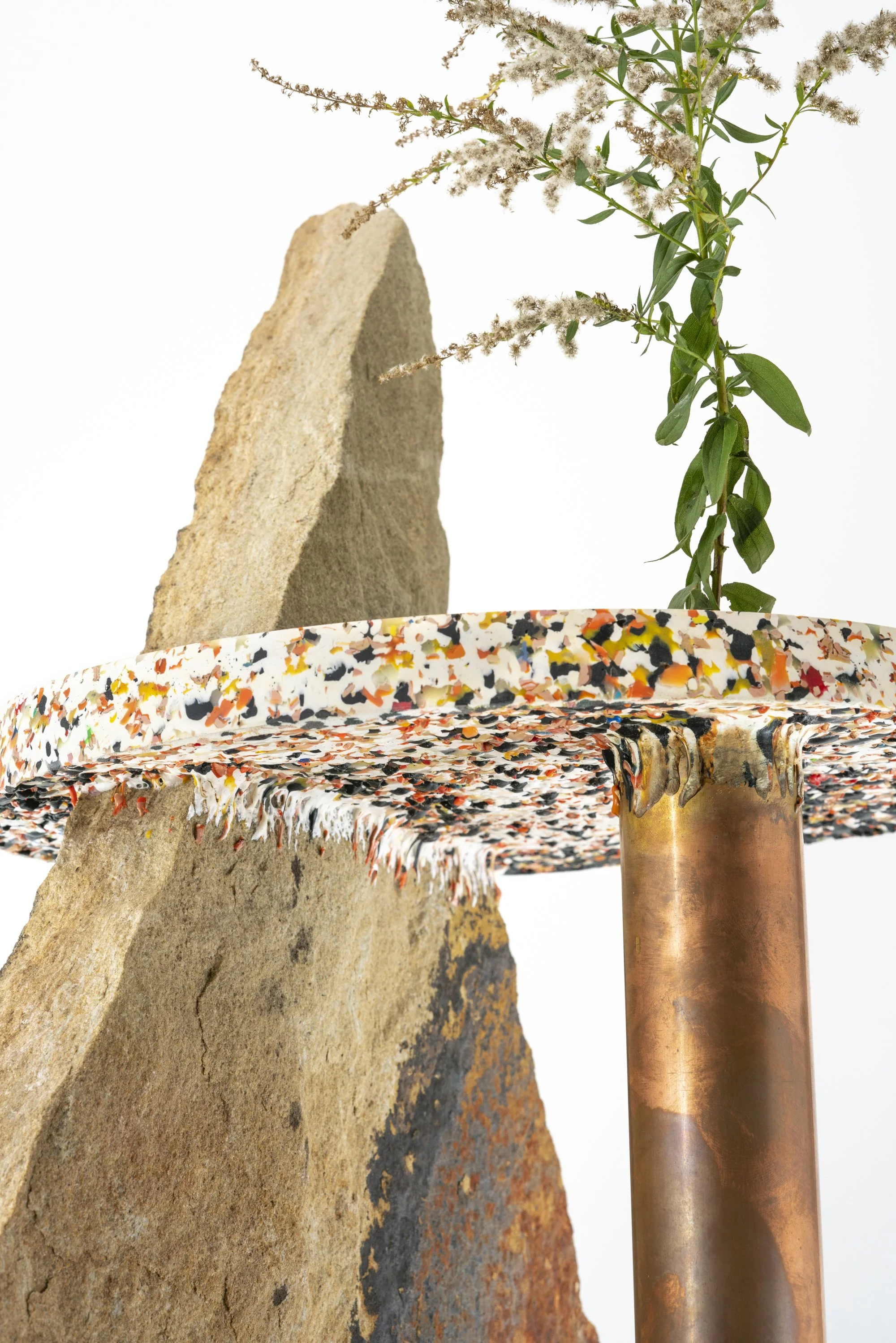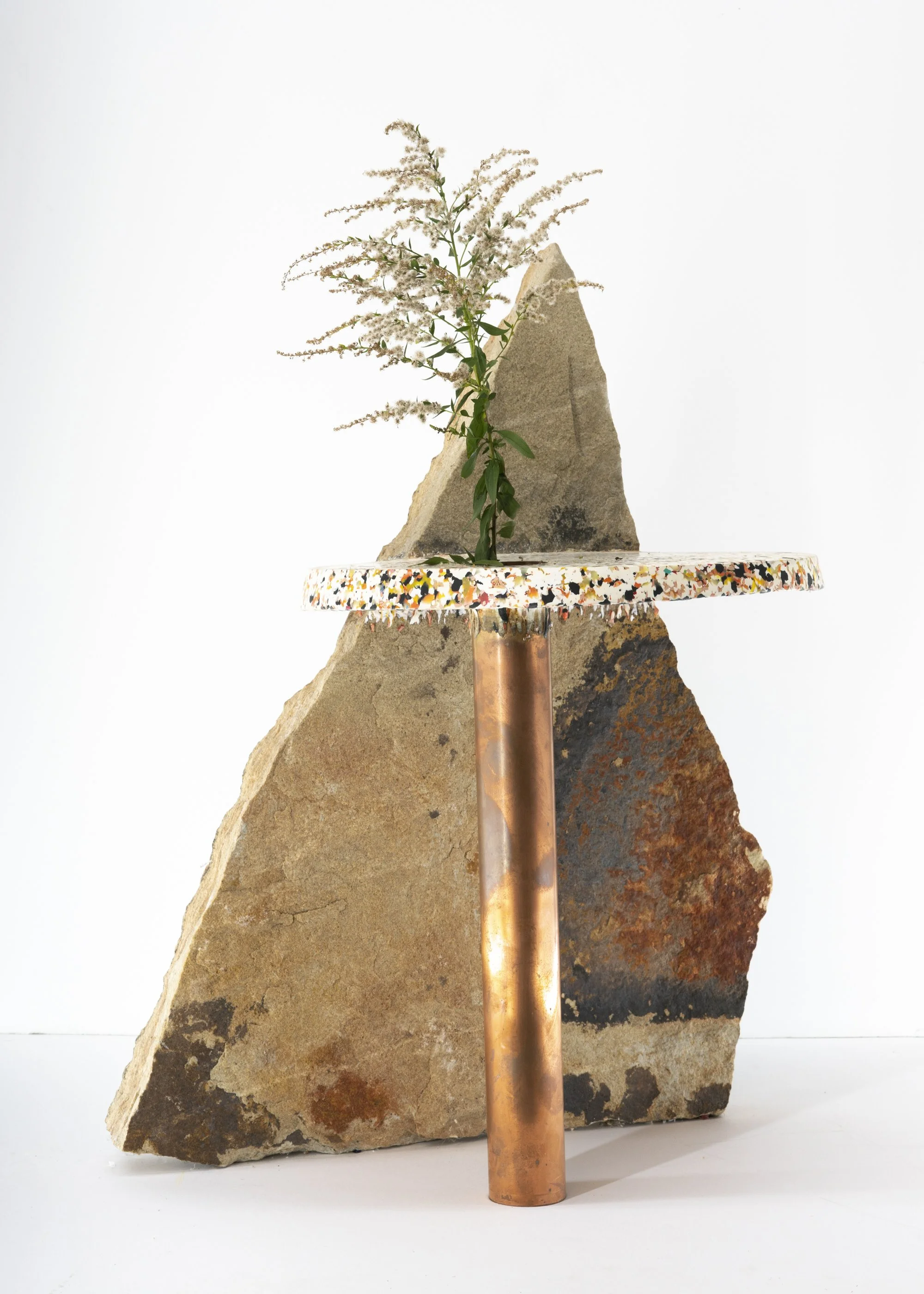 copper, stone, plastic and wildflowers.